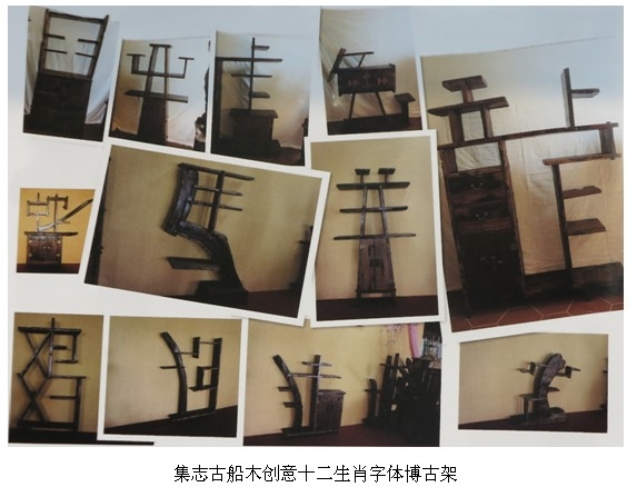 在集志農(nóng)莊的展廳里,各式各樣的古船木家具和裝飾品琳瑯滿目,以深棕黑色為主,大多擁有飽經(jīng)風(fēng)霜的外形和古樸溫潤的質(zhì)感,或被制成奇趣天然的沙發(fā)、茶幾等家具或匠心獨具的屏風(fēng)、隔欄。其中讓孫吉志最為得意的是一套古船木十二生肖字體博古架,其設(shè)計靈感來源于中國古代的象形文字,孫吉志巧妙地將古船木的特殊結(jié)構(gòu)與博大精深的中國漢字文化進(jìn)行結(jié)合,創(chuàng)作了這套獨一無二的作品。
