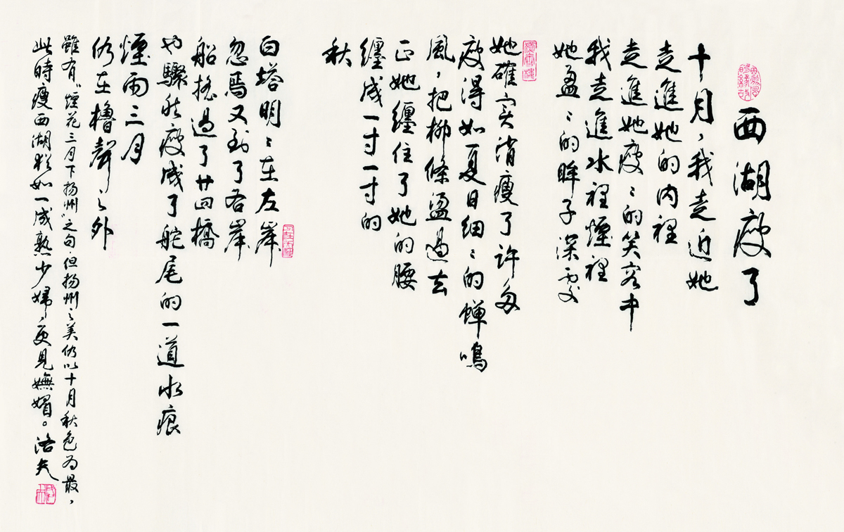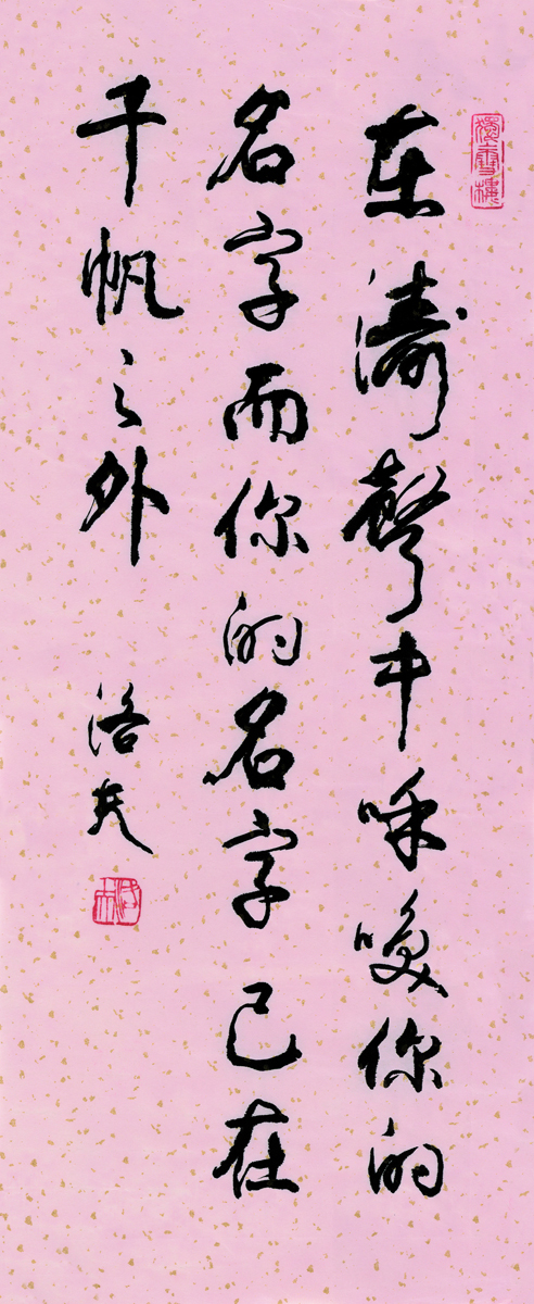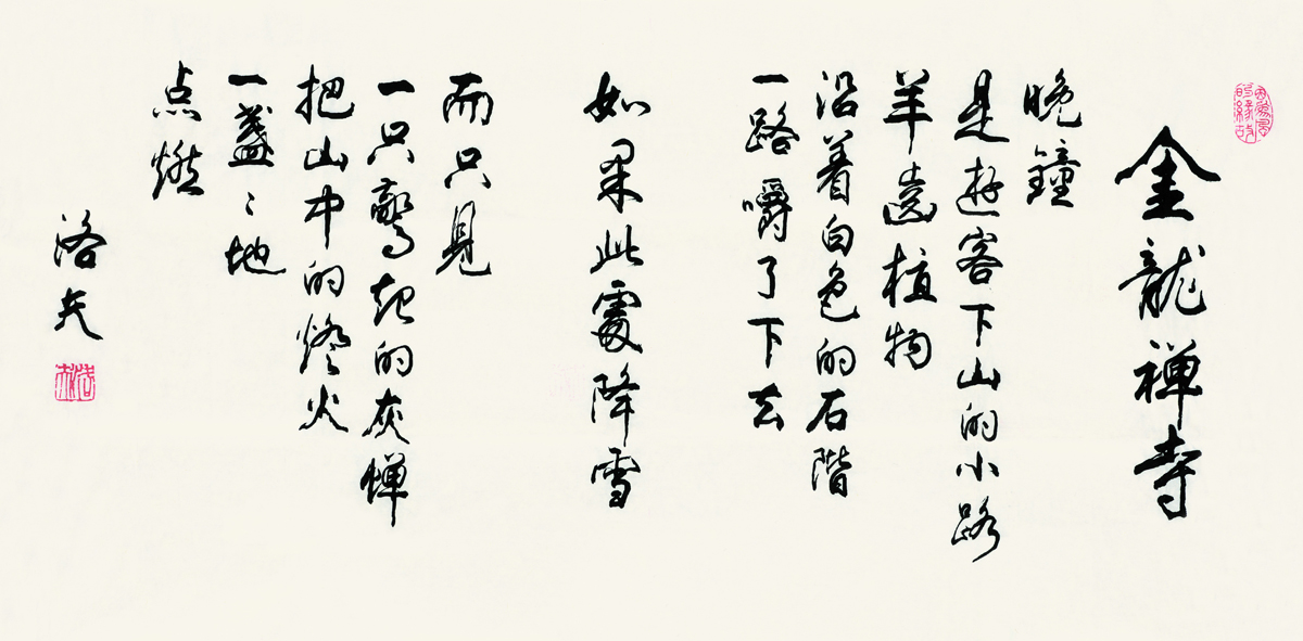 近年來,洛夫還潛心書法創(chuàng)作,臨習(xí)毛公鼎、《石門頌》、懷素《自敘帖》、孫過庭《書譜》、顏真卿《爭座位帖》和米芾行草等經(jīng)典和,長于魏碑漢隸,尤精于行草。洛夫認(rèn)為,書法講究胸中疏氣,求章而不刻意,書法展其心性,而不需過分雕鑿,書法之美美在神采、美在內(nèi)涵、美在學(xué)養(yǎng)、美在空靈、美在意境、美在清新,而書法與詩的結(jié)合,就能體現(xiàn)出浸透了“天涯美學(xué)”的至美意境。