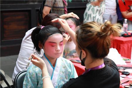 為增強(qiáng)觀眾的體驗(yàn)感與參與感,真正拉進(jìn)昆曲與觀眾的距離,北方昆曲劇院采用教學(xué)與表演相結(jié)合的方式,沿游客行進(jìn)線路再現(xiàn)化妝、練功、學(xué)戲、樂(lè)隊(duì)、服飾、戲班活動(dòng)、舞臺(tái)演出、后臺(tái)工作等情景,直觀鮮活地展示出“百戲之祖”昆曲的藝術(shù)魅力。昆曲戲曲身段體驗(yàn)、妝容體驗(yàn)等互動(dòng)性較強(qiáng)的活動(dòng),吸引眾多大小觀眾爭(zhēng)相參與。