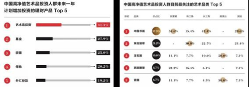 根據(jù)胡潤百富發(fā)布的《高凈值人群藝術品投資報告》中顯示,高凈值人群在規(guī)劃未來一年的投資理財產品時,有41.3% 的人群將投資藝術品作為首選;其對藝術品投資占家庭總投資額的比例平均達到 22.2%。