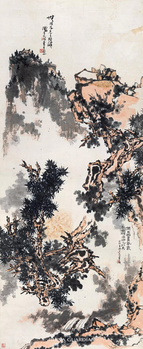 黃賓虹市場代表作品2017年6月19日由北京嘉德拍賣有限公司成交3.45億元的《黃山湯口圖》(171.5x96㎝)。圖畫我國著名風景勝地黃山秀美風景。畫面山勢巍峨屹立,聳入云霄。山中林木蔥郁,渾厚華滋,煙云出沒,氣象恢宏。山下房舍隱現(xiàn),二人坐樹下。圖中山石先用遒勁圓潤有頓挫的線條勾輪廓和脈絡,后用濃淡、干濕墨繁皴密點,赭色相參。蒼松老樹,以古篆法寫之,筆法古樸蒼勁,剛柔相濟。構圖豐滿,墨色光華煥發(fā),韻味無窮。畫面右上角自題“黃山湯口,三十六峰天都、蓮花、前海勝景,由湯口入。九十二叟賓虹。”鈐“黃賓虹”、“黃山老人”二印。此圖乃先生晚年作品,然筆力雄健,全無老態(tài)。山溪樹木一筆不茍,房屋人物刻劃入微,令人驚嘆。