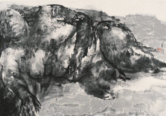 黃駿顯然也是一位在緩沖地帶尋找自己藝術(shù)理想的畫家,只是在趣味上,他似乎比林風(fēng)眠更古典些。他的“線條”(Line)——我們不得不再引入這樣一個更為現(xiàn)代的詞語來進行我們論述——介于“用筆”和“筆觸”之間。作于2013年的《人體No.1》,是一幅即興的寫生。在這里,用于輪廓勾勒的線條若斷若續(xù)、若隱若現(xiàn),它有時交待著形體的轉(zhuǎn)折,有時提示著光影的掩映,它們有其獨立的審美價值,也深深地鑲嵌在物象的形貌之中。他的那些依勢造型、隨機渲染的線條,似乎更象是山水畫中的“皴法”,在表現(xiàn)筆墨自身趣味的同時,也比附了對象的肌理,幾乎讓我們想到了吳昌碩的花鳥畫中的某些品質(zhì)。