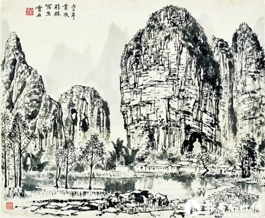 從傳統(tǒng)中走出來的白雪石先生很好的借鑒了西方繪畫中寫生方法,同時又繼承了中國古人“搜盡奇峰打草稿”的創(chuàng)作精神。面對名山大川不僅僅是尊重再現(xiàn)式的表達(dá),而是注重傳達(dá)山水意蘊(yùn)的再創(chuàng)造。白雪石先生把自己走過的地方都變成自己筆下的山水佳構(gòu),黃山松云、太行燕山、湘西勝景……可以說白雪石先生的山水畫創(chuàng)作達(dá)到了“千峰競秀”的境界,然而真正代表他最高藝術(shù)成就的是被世人所稱道的“白家漓江”。1973年白雪石應(yīng)國務(wù)院機(jī)關(guān)事務(wù)管理局邀請,赴廣西桂林沿漓江兩岸徒步旅行寫生,至此開始創(chuàng)作“漓江山水系列”,創(chuàng)作的三十余幅小品在政協(xié)禮堂作觀摩展出,桂林各界人士贊譽(yù)“巧裁桂林千峰秀,妙剪漓江一段云”。