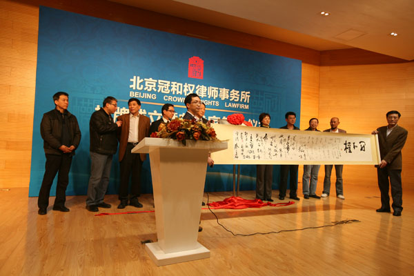 在國家發(fā)布《文化產(chǎn)業(yè)振興規(guī)劃》的政策指引下,宋莊“藝術(shù)原創(chuàng)與展示交易區(qū)”不僅推動著文化藝術(shù)自身的發(fā)展,也集合了文化藝術(shù)產(chǎn)業(yè)鏈上的各種資源;此次冠和權(quán)律師事務(wù)所在宋莊亮相,推動文化藝術(shù)領(lǐng)域法制化建設(shè)的創(chuàng)新之舉就引起了各方面的高度關(guān)注。宋莊鎮(zhèn)黨委書記李霞,中國對外文化交流協(xié)會副會長、北京市參事、原文化部文化產(chǎn)業(yè)司副司長董俊新,全國城市文化產(chǎn)業(yè)聯(lián)盟常務(wù)副會長李小磊、中國藝術(shù)節(jié)基金會會長田建平,中國對外文化集團副總經(jīng)理閻東等政府及文化產(chǎn)業(yè)界的領(lǐng)導(dǎo)蒞臨活動現(xiàn)場。同時出席儀式的還有海峽兩岸友好聯(lián)誼會會長黃財旺、秘書長黃淑芬,中國收藏家協(xié)會副秘書長、陶瓷收藏委員會主任荊治中,書法教育主編、中國書法家協(xié)會權(quán)益保障委員會、教育委員會委員長章巧珍以及,中國民生銀行北京分行私人銀行部副總裁劉瑾等。