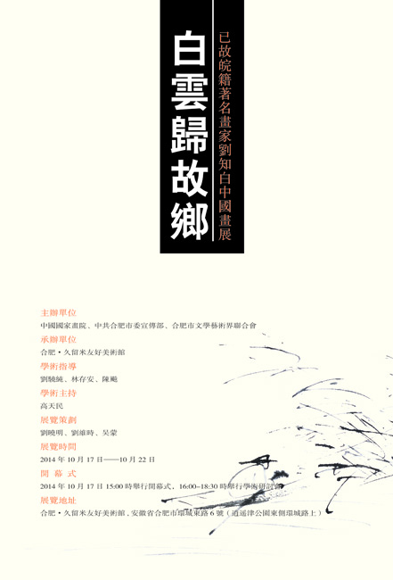 由中國(guó)國(guó)家畫(huà)院、中共合肥市委宣傳部、合肥市文學(xué)藝術(shù)界聯(lián)合會(huì)共同主辦,合肥·久留米友好美術(shù)館承辦的“白云歸故鄉(xiāng)——已故皖籍著名畫(huà)家劉知白中國(guó)畫(huà)展”將于2014年10月17日15:00時(shí)在安徽省合肥市合肥·久留米友好美術(shù)館開(kāi)幕。
