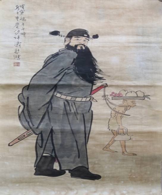 鐘馗在中國傳統(tǒng)文化中是捉鬼的神,其相貌丑陋,卻心地善良,嫉惡如仇,是非分明。人們常掛鐘馗畫以辟邪驅(qū)魔,歷代畫家也多有涉獵鐘馗形象。自鐘馗畫出現(xiàn)以來,鐘馗形象都是面貌丑陋、樣子古怪的,但是徐悲鴻先生筆下的鐘馗明顯以現(xiàn)實生活的人為原型,比例適度,神態(tài)飽滿,充滿了人情味。