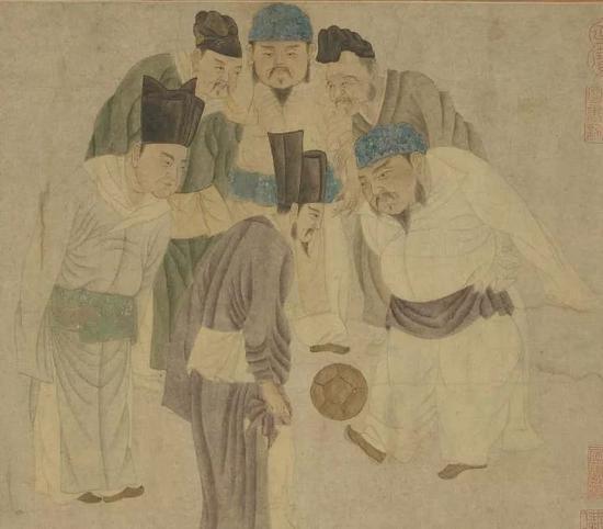 宋史或宋代筆記中多有這方面的記載,宋太宗趙光義尤愛蹴鞠?!端问贰肪硭摹短趥鳌酚涊d:“(太平興國五年,980年)三月戊子,會親王、宰相、淮海國王及從臣蹴鞠大明殿?!本矶侔耸锻鯓s傳》也有記:“張明起賤微中,以蹴鞠事朕,潔己小心,見于輩流。夫刑罰之加,必當(dāng)其罪?!本减砭系膱鼍埃坪踉诋?dāng)時是比較常見的。