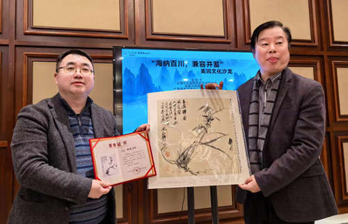 秘書(shū)長(zhǎng)張文容代表基金會(huì)理事長(zhǎng)吳超先生向加拿大收藏家協(xié)會(huì)回贈(zèng)禮品