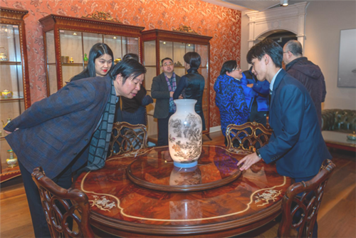 與會(huì)嘉賓對(duì)藝術(shù)生活、酒文化、餐飲文化和紀(jì)念吳昌碩誕辰180周年策劃北美地區(qū)的活動(dòng)展開(kāi)卓有成效的討論,就以播美覓真揚(yáng)善為己任,弘揚(yáng)東西方美學(xué)思想和成果,提升生命境界,推動(dòng)文明發(fā)展和社會(huì)進(jìn)步的美潤(rùn)文化活動(dòng)給予充分肯定和認(rèn)可。會(huì)后大家參觀了順風(fēng)餐飲集團(tuán)的藝術(shù)館,鑒賞了極致精美的陶瓷藝術(shù)品和其他藏品。